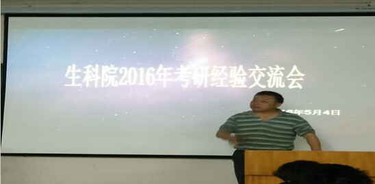 会议在19:00正式拉开帷幕,首先上台发言的是生科1201班的何乾坤,他以自己能考上武汉大学的亲身考研经历跟同学们分享了专业课的学习经验:关键在于夯实基础,正确运用学习方法,不断积累最终达到滴水穿石的效果。考取华南师范大学的闵娜学姐与大家交流了英语的学习重点,在于词汇的积累和语言的理解技能。而考上四川大学的詹浩淼学长则分享了关于专业课生物化学的学习技巧。作为即将步入江南大学的朱丽飞学长来说,他更侧重的是关于发酵工程的更加专业的解释。进入华南农业大学的李维学长与同学们分享的更多的是他考研的心路历程,把握好心态才是制胜的法宝。王知龙学长向大家讲述了他高数102分的秘诀在于坚持,每天早上三小时的题海训练,厚积薄发,最终成就他进入华中农业大学的愿望。生科1201班的程超在留学交流和留学宣讲会的双重压力下,以两个月的时间创造奇迹,成功考入华中师范大学。后来考入武汉轻工大学的查三省同学通过反省自己的考研方法,给大家留下了宝贵的经验。会议上几位考研代表各展风采,赢得了现场阵阵掌声,会议气氛分外高涨。