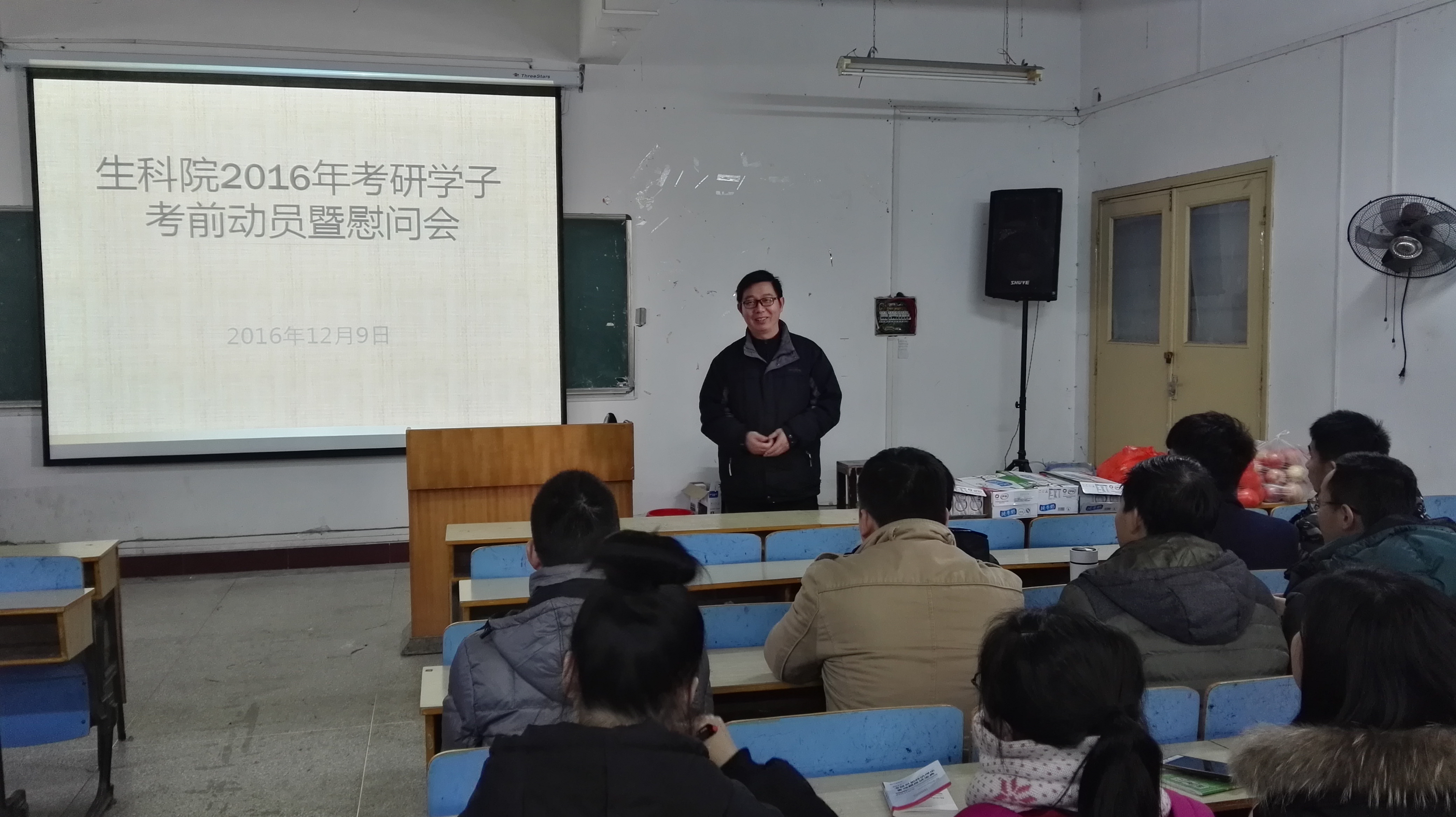 2016年12月9日中午12点,生科院2016年考研学子考前动员暨慰问会在生物楼合01教室举行。参加本次会议的有公司党总支书记刘世旺教授,党总支副书记夏小环老师,辅导员黄健老师以及2013级110名报考研究生的学子,此次会议由夏书记主持。