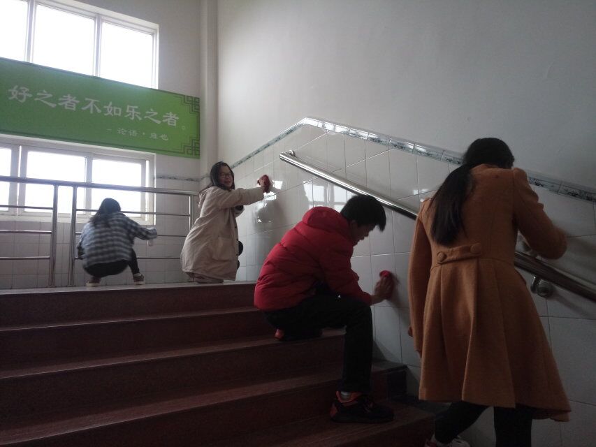 活动开始,事先分好的各组成员在组长的带领下马上投入到义务清扫的工作当中,有的弯腰擦着脚边的瓷砖,有的挥舞扫帚在清扫宣传栏和门框上的灰尘,还有的不嫌脏臭认真地将窗台内外收拾干净。整个生物楼都弥漫着“学雷锋”志愿者们的火热激情,院楼的老师和领导们也都在为志愿者们的行为点头赞扬。