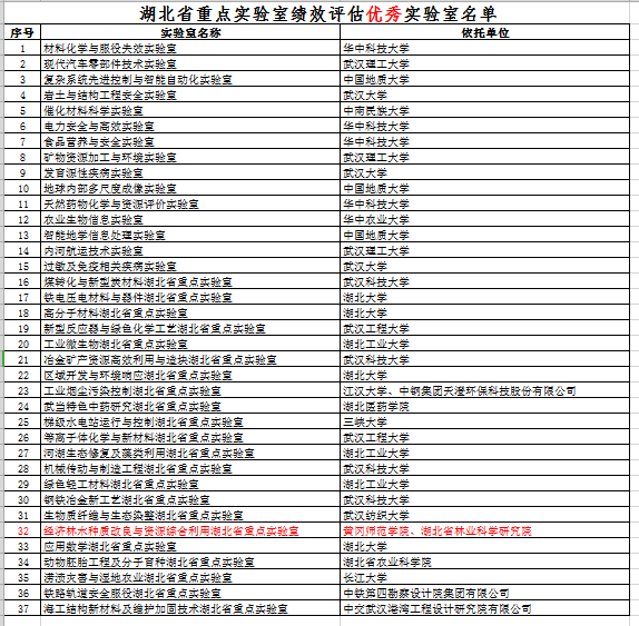 根据《湖北省重点实验室管理办法》、《湖北省重点实验室年度绩效考核实施办法》相关要求,2017年湖北省重点实验室绩效评估复评已完成专家评审,现将评估为“优秀”的实验室名称、依托单位等向社会公示。(http://www.hbstd.gov.cn/tzgg/tzgg/75832.htm)