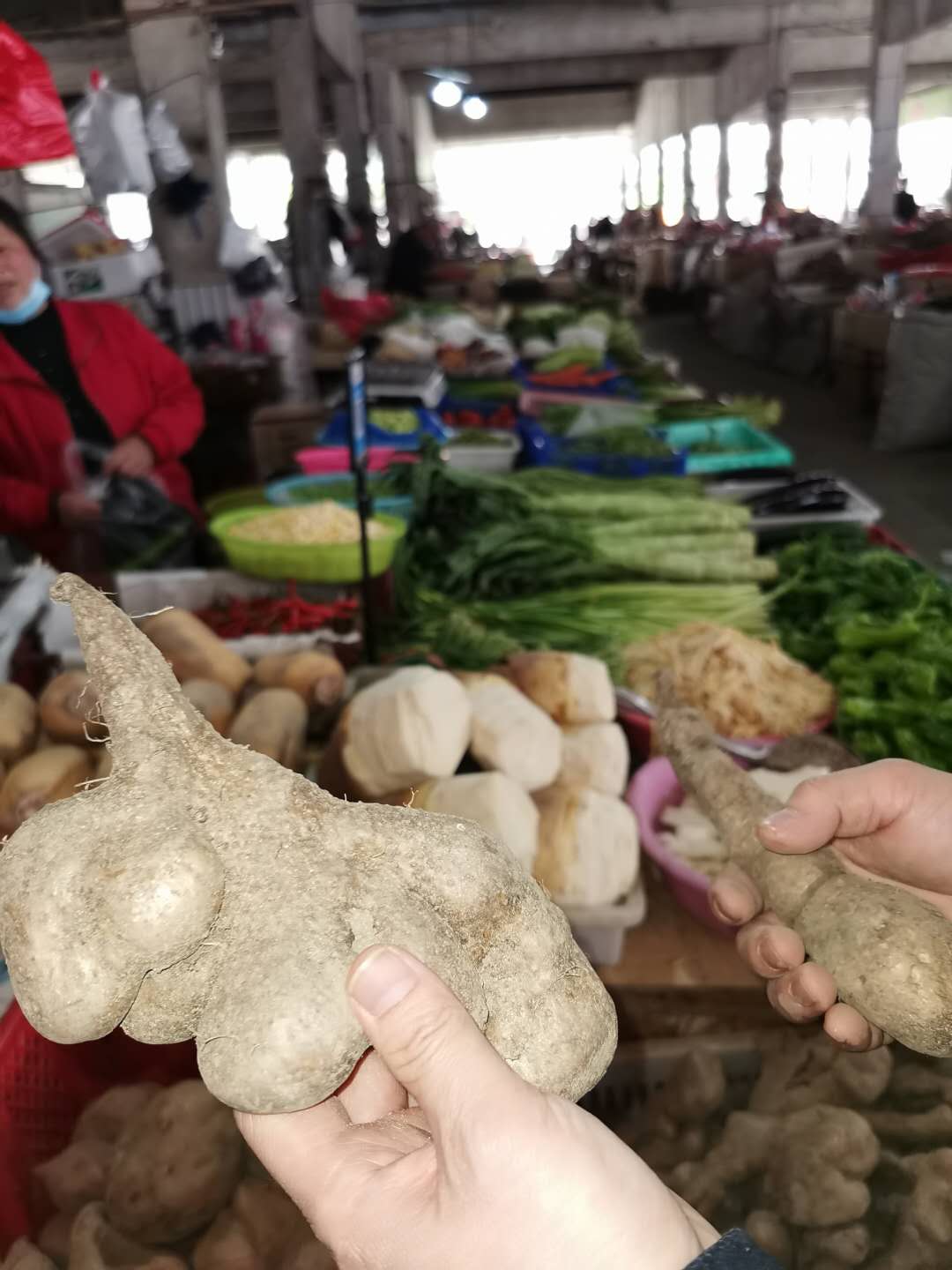 调研人员到达当地具有佛手山药种植传统的同心村后,立即下到田间地头展开调查,并将山药品种免费分发给当地农民,并为后期山药品种比较及种质改良研究工作做准备。期间还同梅川镇农技站管理人员就山药育苗、山药种质改良等技术及市场现状进行面对面交流。调研人员还走访当地菜市场,实地查看山药销售情况。