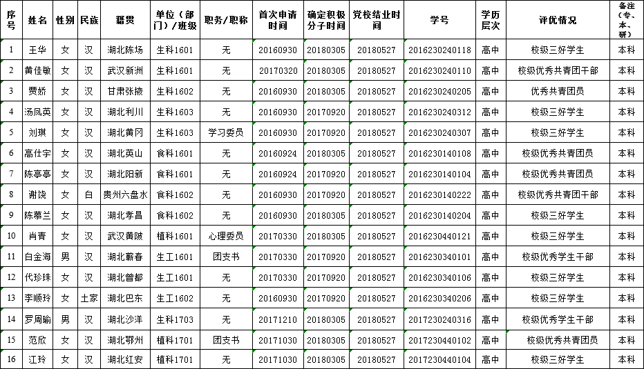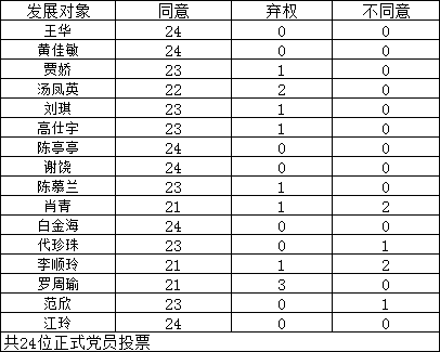根据发展党员公示制度要求,经威廉希尔员工党支部考察和研究,支部大会表决通过,拟接收 王华等16位同志为中共预备党员,现将个人情况及投票结果予以公示。