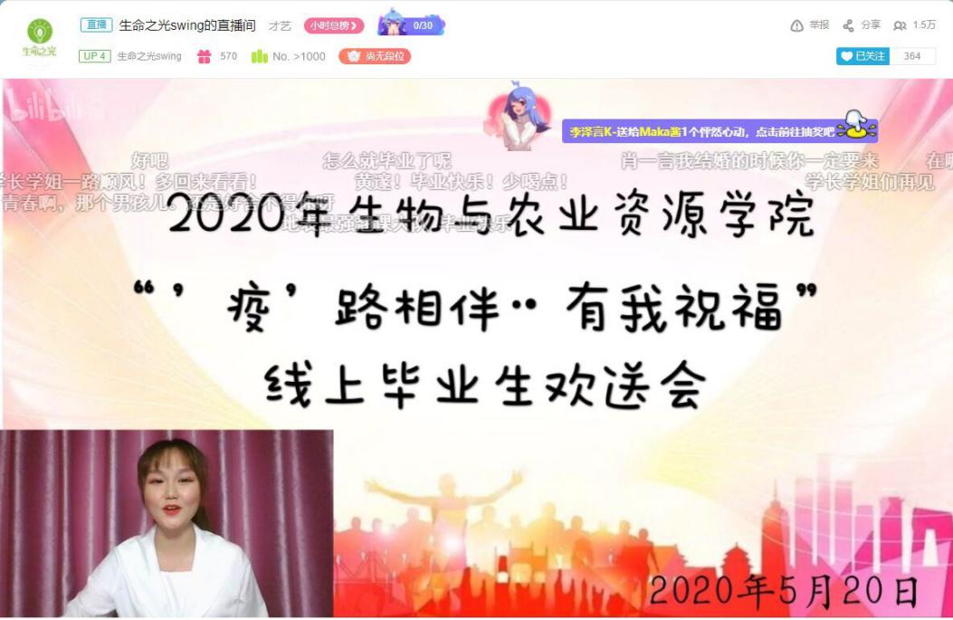 经过一个月的精心策划与筹备, 5月20日晚,2020年威廉希尔“‘疫’路相伴·有我祝福”线上毕业生欢送会在哔哩哔哩网站“生命之光swing”公众号直播间温情上演。在这新冠肺炎的特殊时期,生农公司的领导老师和同学们以这种别样的方式送别2020 届毕业生,期望为即将毕业的生农学子们留下一段美好的回忆,并为他们的老员工活划上一个圆满的句号。欢送会由威廉希尔主办,团委员工会自律委员会承办,共计1.5万余人同时在线观看了本次欢送会。