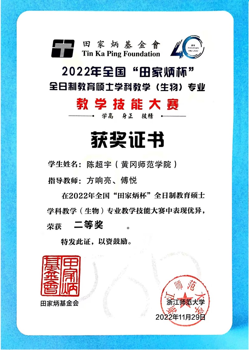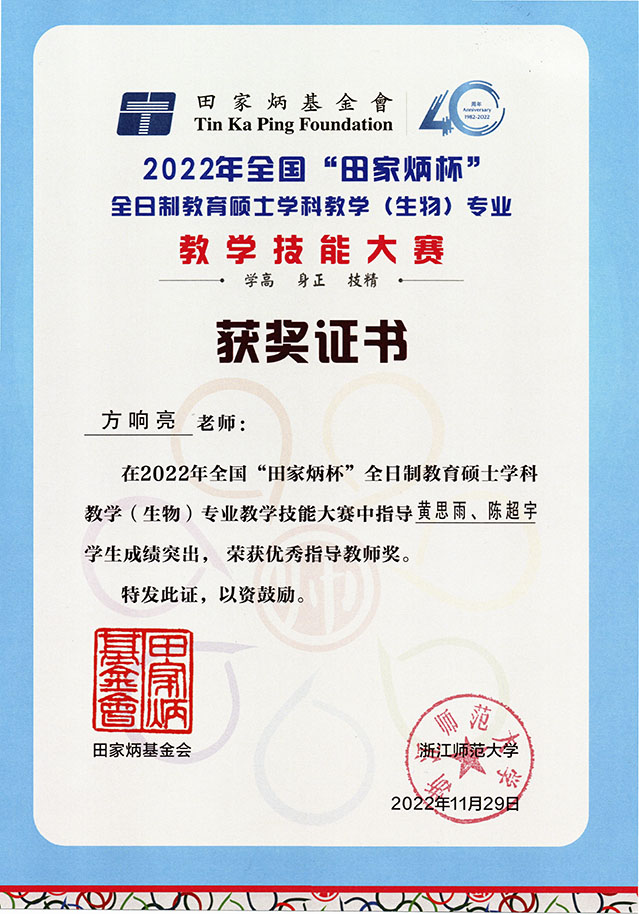 2022年11月全国“田家炳杯”全日制教育硕士学科教学(生物)专业教学技能大赛圆满落幕,生农公司2020级研究生陈超宇、2021级研究生黄思雨荣获全国总决赛二等奖,2021级研究生李冰倩、马伊琳荣获“优秀教学设计奖”,方响亮老师荣获“优秀指导教师奖”。
