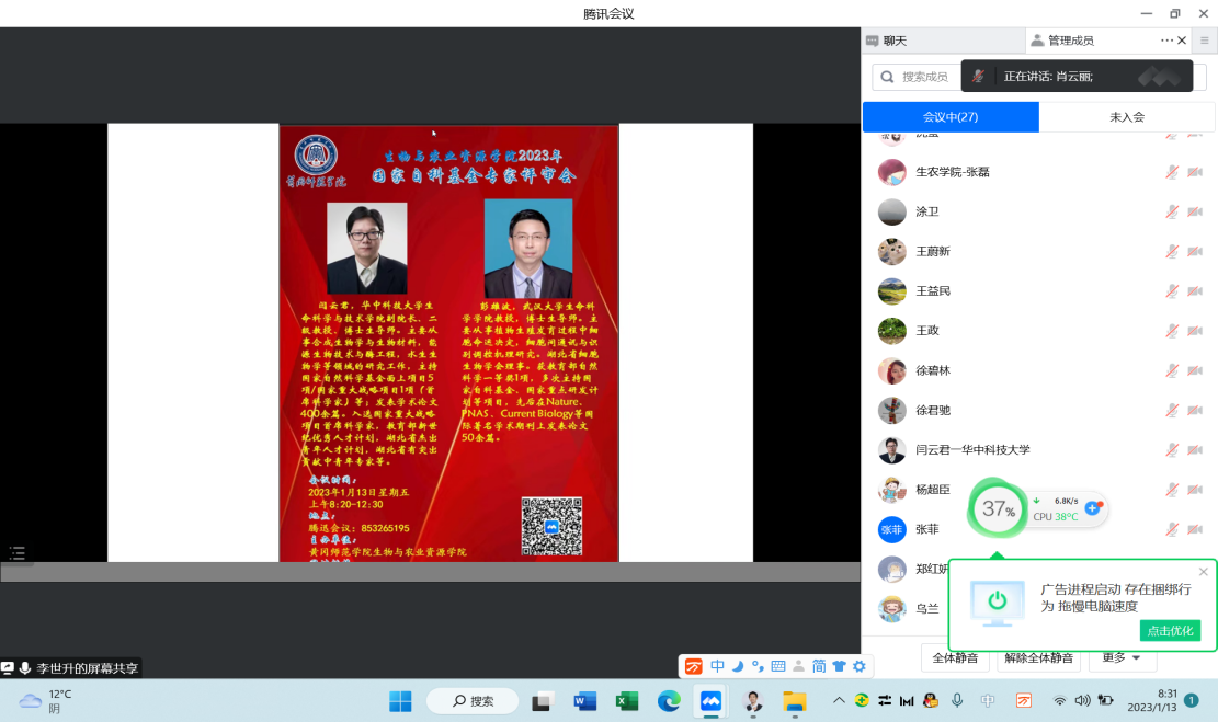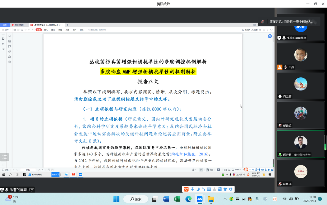 为扎实推进2023年国家自然科学基金项目申报工作,进一步提高国家自科基金项目申报质量和水平。1月13日,公司通过腾讯会议形式,线上举办了2023年国家自然科学基金项目院级专家评审会。评审会邀请到华中科技大学阎云君教授、武汉大学彭雄波教授作为评委,对公司老师的国家自然科学基金项目申请书进行逐一指导。经理肖云丽教授、全体学科团队成员参加了会议,会议由李世升副经理主持。