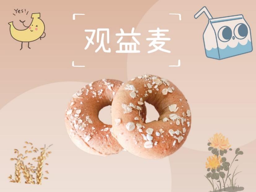 品贝果,观益麦,优选全麦,富含益生菌,尽显健康追求,香蕉酸奶块燕麦三合一,低脂无负担。农忙时节,“观益麦”香,与君共鉴。