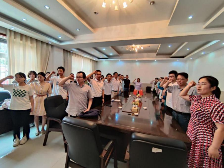 随后,大家来到园区会议室,由教工支部书记傅悦领誓,带领大家重温入党誓词,接受深刻的精神洗礼和党性教育。李世升副经理还给大家讲授了“以学习调研为契机,推动学科团队发展”的微党课。
