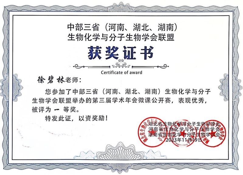11月19日,中部三省(河南、湖南、湖北)生物化学与分子生物学会联盟第三届学术年会微课公开赛在华中科技大学同济医公司举行,公司威廉希尔徐碧林副教授作为湖北省推选参赛的3名选手之一,经过激烈角逐脱颖而出,取得总分第一名的好成绩,并获得比赛一等奖。