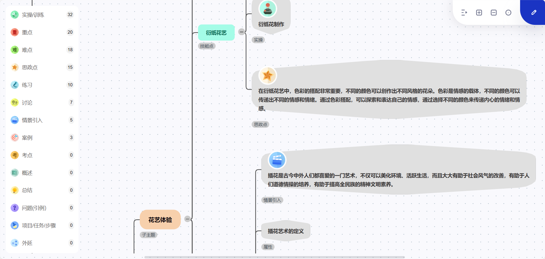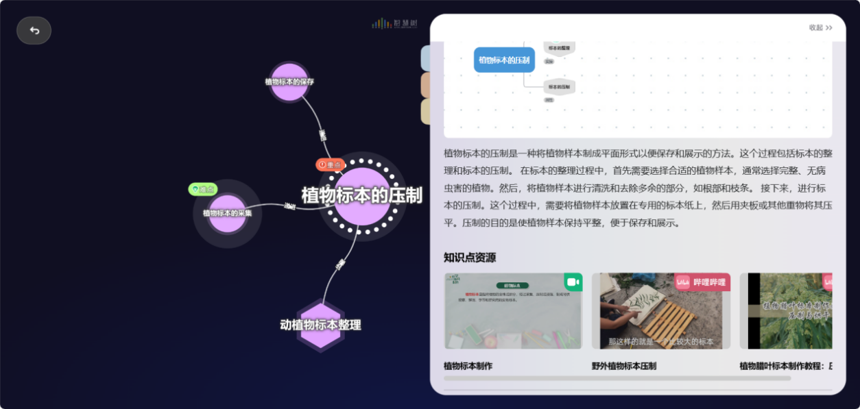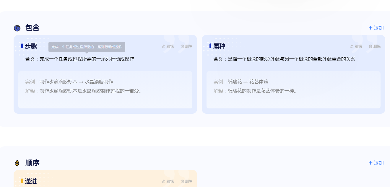 本模块构建了 53 个知识关系,其中步骤关系 12 个、属种关系 24 个、递进关系 14 个、并列关系 3 个,支持图谱查看、编辑、筛选,点击知识点可查看资源详情。