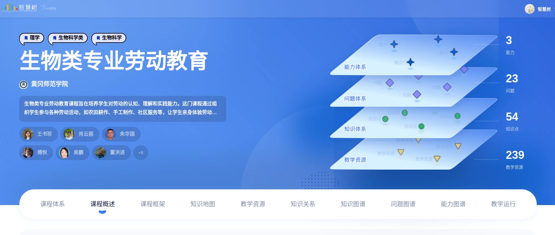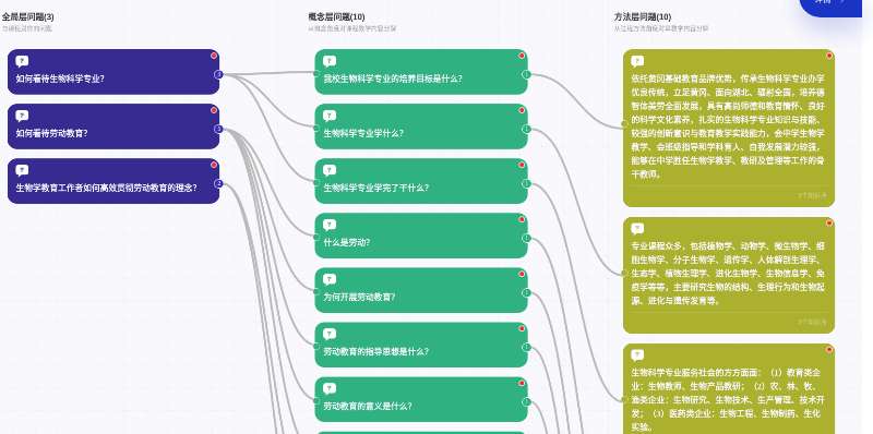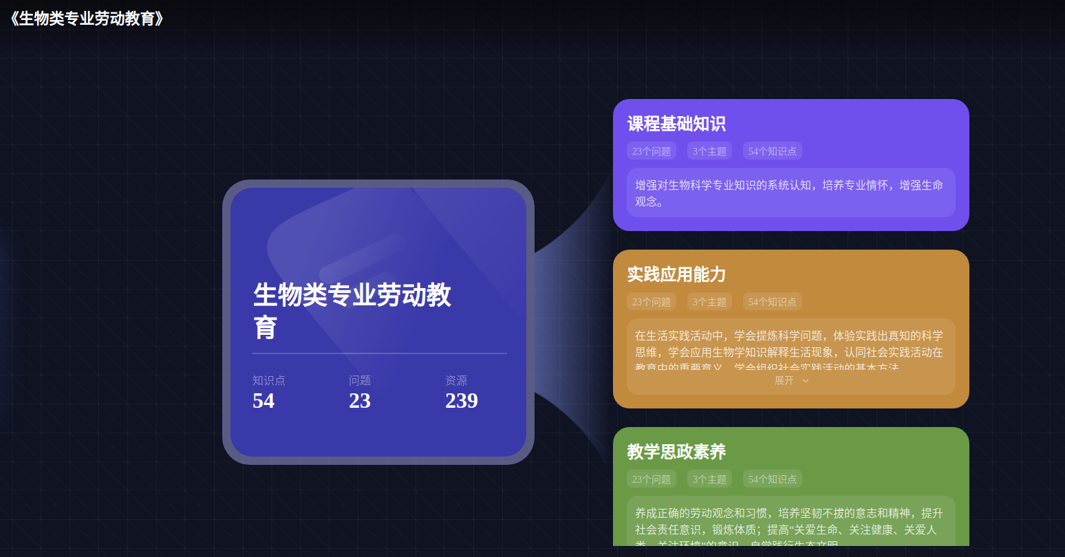 《生物类专业劳动教育》课程包括3个能力、23个问题、54个知识点、239个教学资源,构建形成课程四维知识体系。
