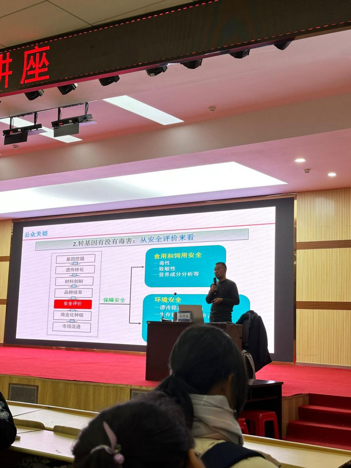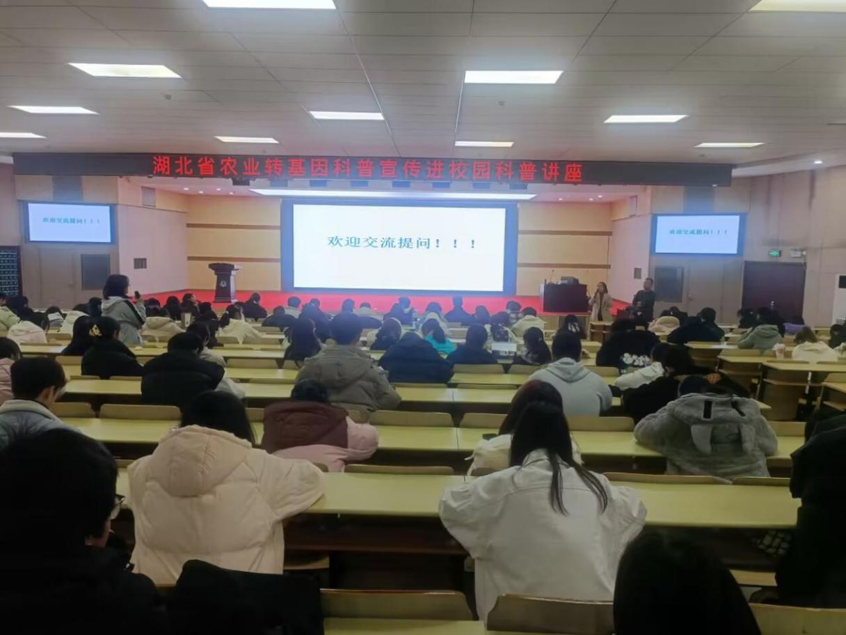 讲座现场气氛活跃,科普宣传效果显著。在答疑交流环节,在场师生积极互动交流,同学们热情高涨,多名同学不断踊跃发言提出自己的疑问。肖云丽、朱华国逐一进行了详细解答,让大家对转基因相关知识有了更深入的了解。