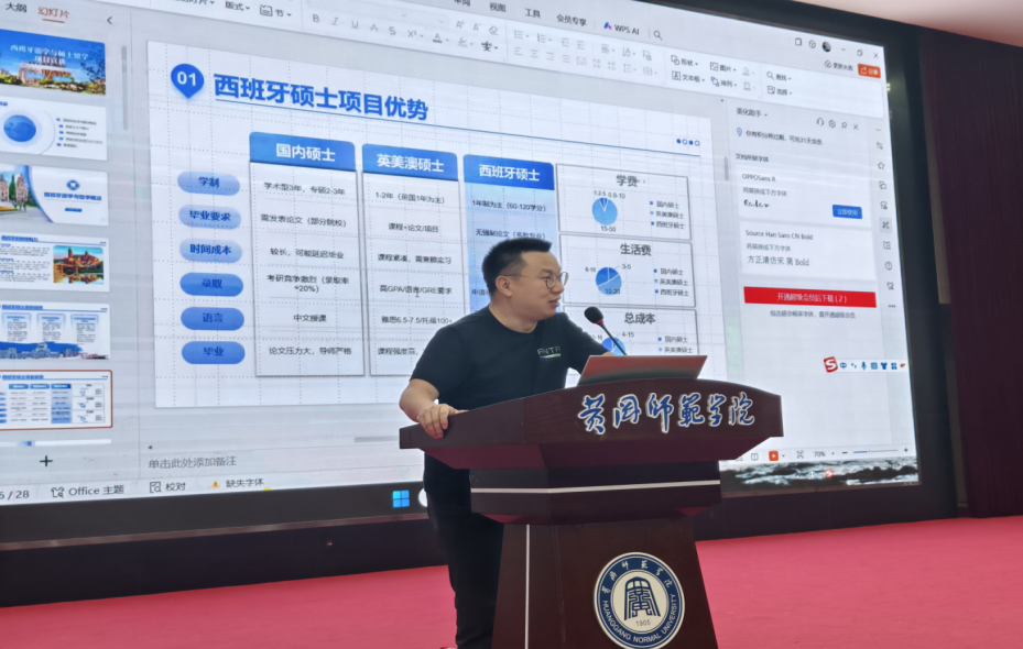 文公司副教授郑凯应邀作了留学深造经验交流分享,重点解读了西班牙海外留学项目概况、留学申请流程与规划建议。