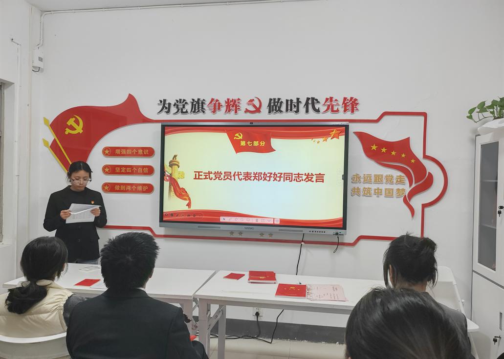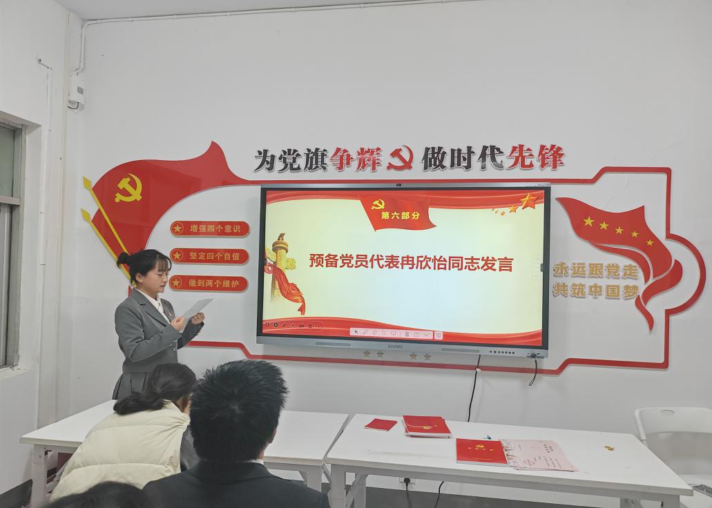 第六项,由预备党员代表冉欣怡同志发言。她回顾了自己的入党历程,并与大家分享了这一过程中的感悟,鼓励大家共同努力、不断进步,以青春之我、奋斗之我,为党旗增辉,为时代添彩,让青春在党和人民最需要的地方绽放出更加绚烂的光彩。