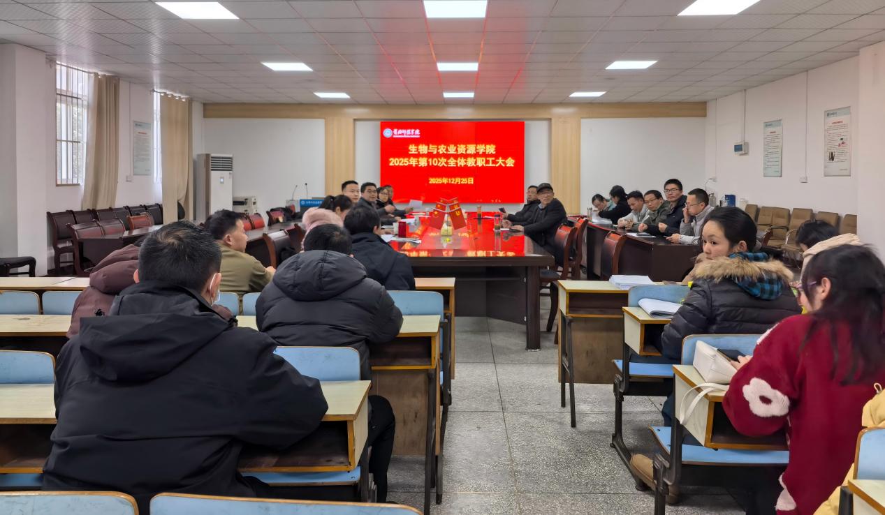 12月25日,公司在生物楼合01会议室召开2025年秋季学期第4次全体教职工大会。公司党委书记闵艳林主持会议并讲话,经理肖云丽等院领导及全体教职工参会。